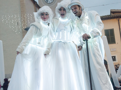 Trampoli, effetti pirotecnici, fuochi d'artificio, pregiati costumi e maschere decorate, artisti di strada, teatro urbano.