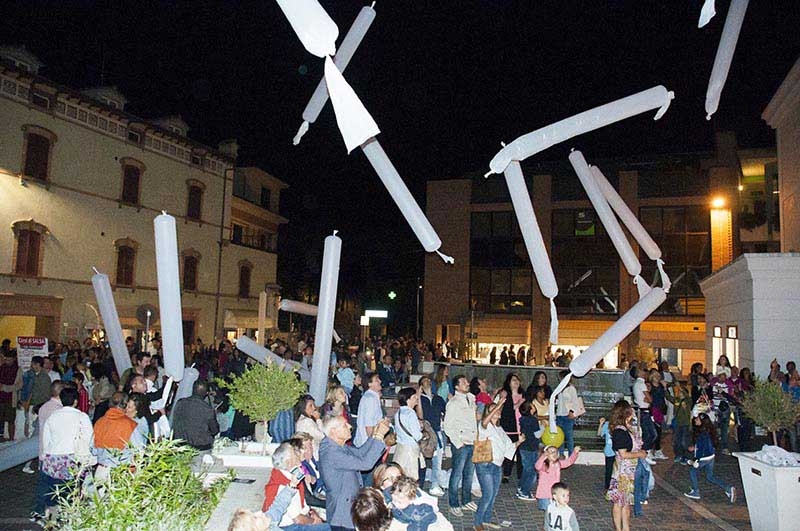Al termine dello spettacolo itinerante verranno distribuiti tra il pubblico dei palloni della lunghezza di 3 metri che si dovranno gonfiare con una breve corsa e che daranno vita ad una animazione di piazza particolare e coinvolgente che contribuirà a colorare di bianco l'intera area ritmati dalla musica e dai lanci chiamati della compagnia teatrale.
